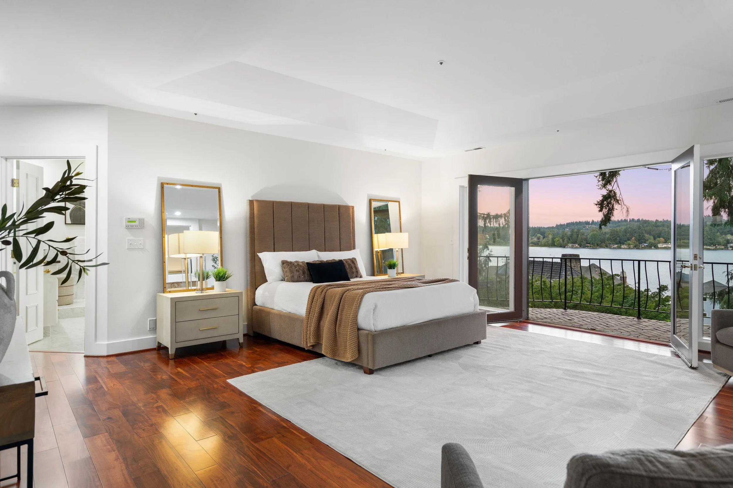 This extensively updated home features 4 bedrooms, 2.5 bathrooms, and a 3-car garage. Inside, you’ll find soaring vaulted ceilings in the great room with a gas fireplace and Juliet balcony framing picturesque views of Lake Washington and Mt. Rainier. A dedicated office/library sits just off the entry, while the formal dining room opens through French doors to a sunlit deck. The chef’s kitchen is designed for both cooking and gathering, showcasing brand new quartz counters, stainless steel appliances, gas range, butler’s pantry, and a cozy brick fireplace with an adjoining sitting area that leads to another deck overlooking the lake.