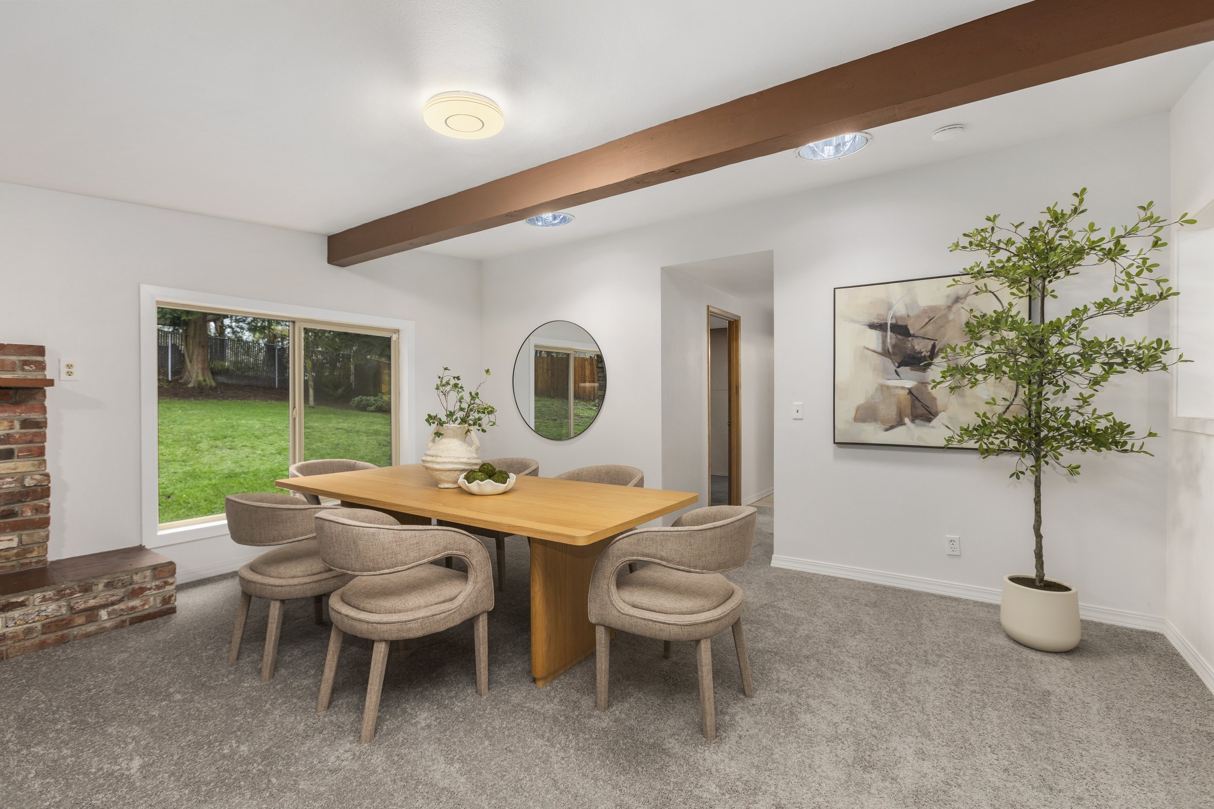 Inside, a versatile floor plan unfolds with two distinct living areas, offering flexibility for how you live, work, and gather. The main living space is rich with character, featuring exposed wood beams and a cozy gas fireplace that creates a warm, inviting atmosphere. The dining area is truly dinner-party ready — with room for a long table, lively conversations, and memorable evenings with friends and family.